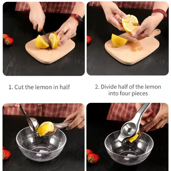 • Comfortable, durable and stable. Cut the lemon in half, press the lemon on the lemon juicer, and then gently press the handle to easily squeeze